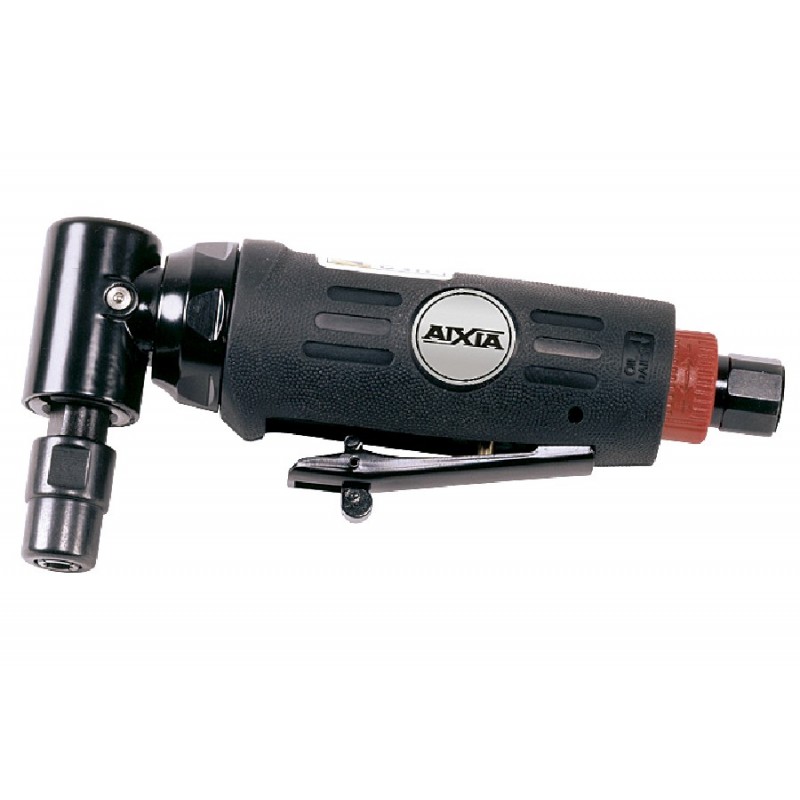 Amoladora acodada. Se utilizan principalmente con muelas y fresas de vástago en trabajos de troquelería y ajustes de piezas metálicos. Pinza de 6, capacidad de muela o fresa 25, potencia 300w, velocidad 20.000R.P.M., longitud 156mm, peso 0,6kg., consumo 250 litros/minuto, Ø interior de manguera 8, rosca de entrada 1/4. Para uso continuo.