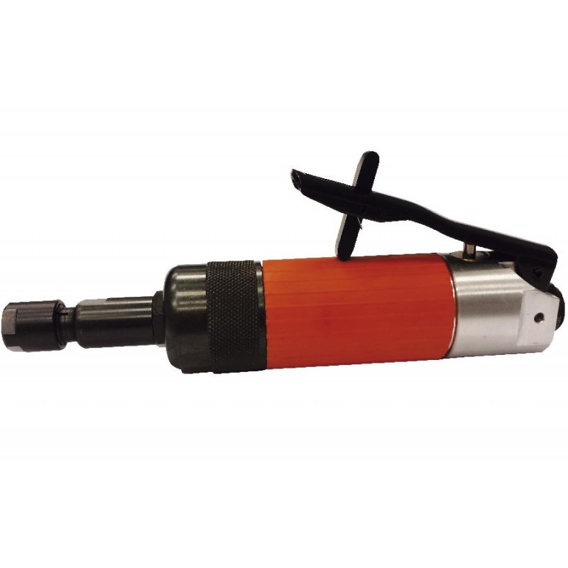 Amoladora neumática de pinza recta, con pinza de 6, capacidad 50, potencia 300w, velocidad 24.000R.P.M., longitud 172mm, peso 0,6kg, consumo 400litros/minuto, manguera Ø interior 10, rosca de entrada 1/4. Opcional casquillo Ø3, consultar pinza Ø8. Para uso continuo e intenso.