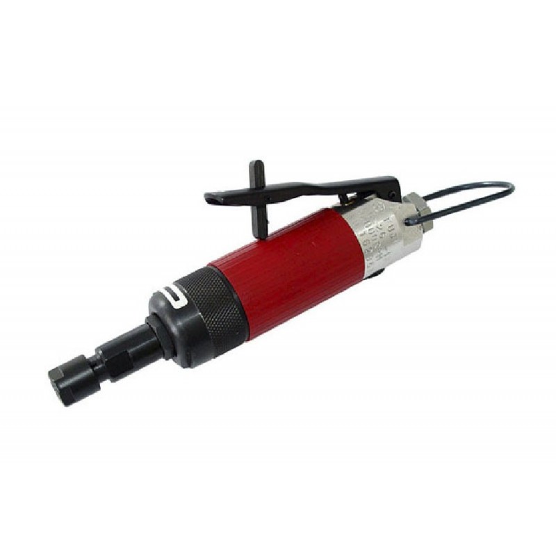 Amoladora neumática de pinza recta, con pinza de 6, capacidad 50, potencia 350w, velocidad 18.000R.P.M., longitud 161mm, peso 0,8kg, consumo 430litros/minuto, manguera Ø interior 10, rosca de entrada 1/4. Opcional casquillo Ø3, consultar pinza Ø8. Para uso continuo e intenso.