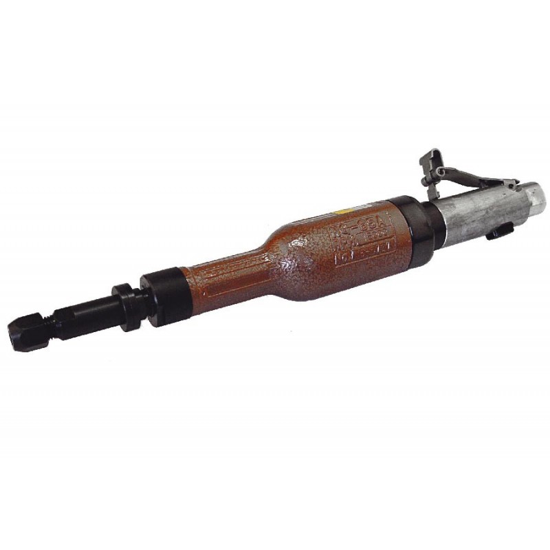 Amoladora neumática de pinza recta, con pinza de 6, capacidad 65, potencia 500w, velocidad 16.000R.P.M., longitud 360mm, peso 1,2kg, consumo 500litros/minuto, manguera Ø interior 10, rosca de entrada 3/8. Consultar pinza Ø8. Para uso continuo.