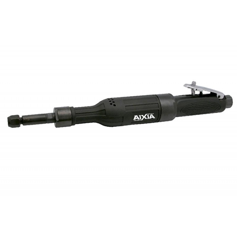 Amoladora neumática de pinza recta, con pinza de 6, capacidad 75, potencia 500w, velocidad 14.600R.P.M., longitud 395mm, peso 1,74kg, consumo 600litros/minuto, manguera Ø interior 10, rosca de entrada 3/8. Consultar pinza Ø8. Para uso continuo.