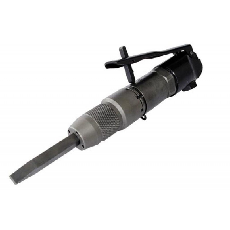 Martillo cincelador con forma del alojamiento del cincel redondo 11, pistón Ø20, carrera 16, número de golpes 12.000, longitud 201mm, peso 1,0kg, consumo 140 litros/minuto, Ø interior de manguera 8. Para uso continuo e intenso.