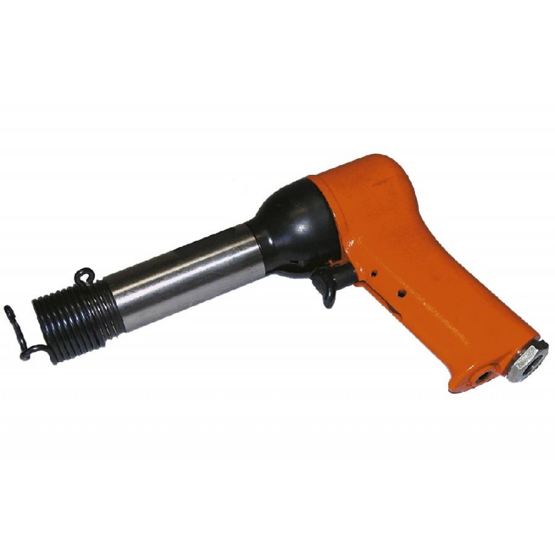 Martillo con tipo de alojamiento de cincel circular, capacidad de corte de remache en aluminio 6,4, en acero 5, Ø pistón 12,7, carrera 100, nº de golpes 1.800, longitud 197mm, peso 1,4kg., consumo 350 litros/minuto, Ø interior de manguera 10, para uso continuo e intenso.