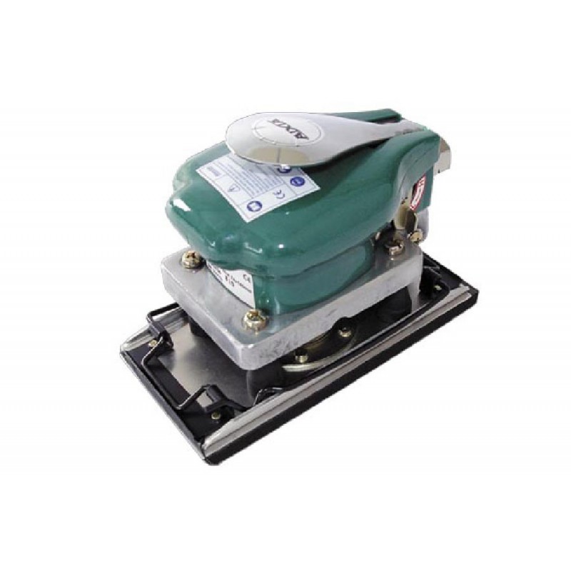 Lijadora orbital sin aspiración con base rectangular de 74x145 adhesiva y con pinzas, órbita 5, velocidad 8.000R.P.M., peso 1,2kg., consumo de aire 350 litros/minuto, manguera Ø interior 10, rosca de entrada 1/4. Para uso continuo e intenso.