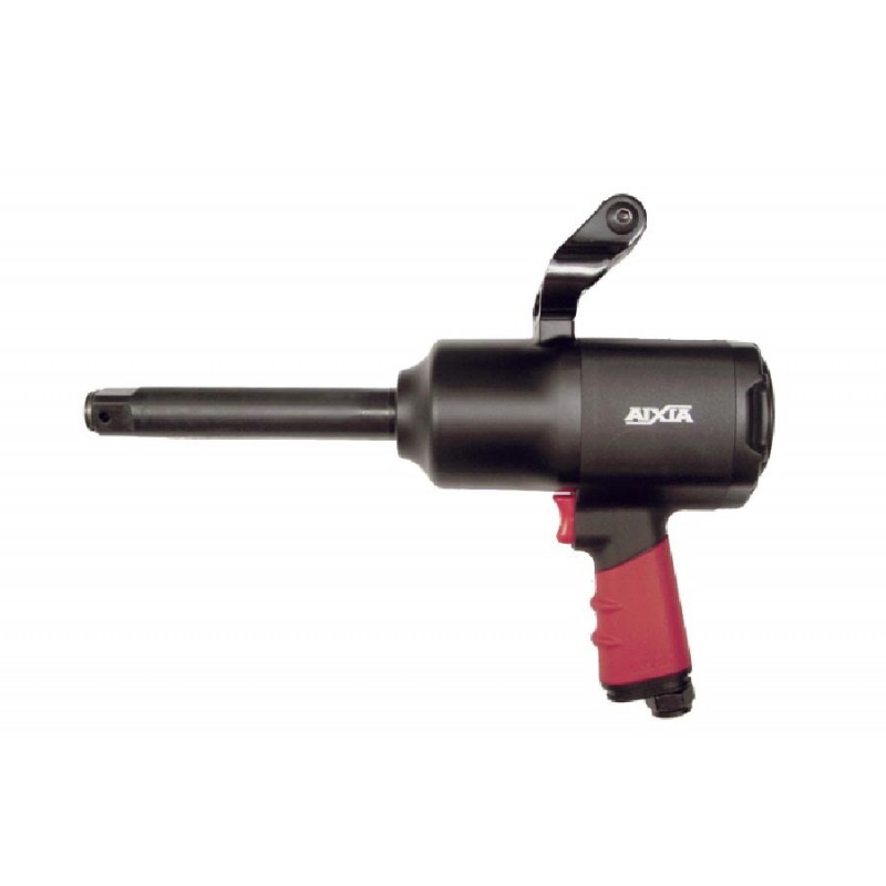 Llave de impacto tipo pistola neumática cuadradillo de 1". Se utiliza en apriete y desapriete de tornillos y tuercas en industria y garajes de reparación de vehículos. Uso continuo e intenso. Capacidad M-33, par de apriete 2.034Nm, velocidad 5.300rpm, longitud 400mm, peso 5,8kg., consumo 650 litros minuto, manguera Ø interior 13, rosca de entrada 3/8"