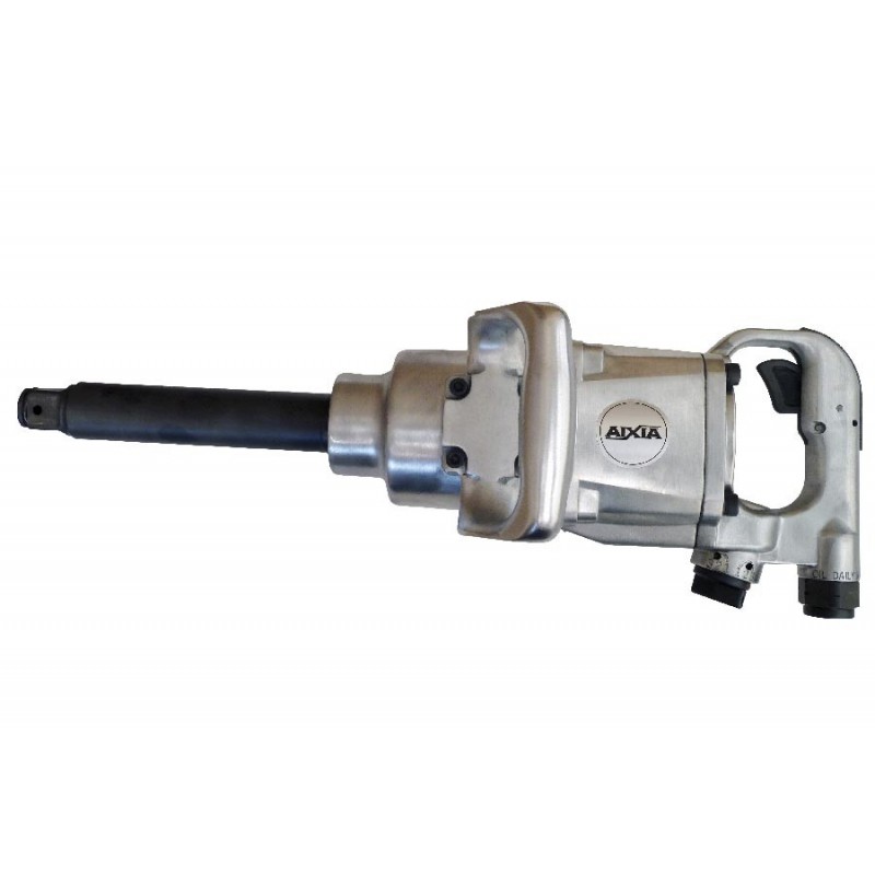 Llave de impacto neumática (eje largo), uso en industria y talleres de vehículo industrial y garajes de neumáticos. Cuadradillo de 1". Uso continuo e intenso. Capacidad M-33, par de apriete 2.200Nm, velocidad 4.000rpm, longitud 520mm, peso 11,3kg., consumo 600 litros minuto, manguera Ø interior 13, rosca de entrada 3/8"