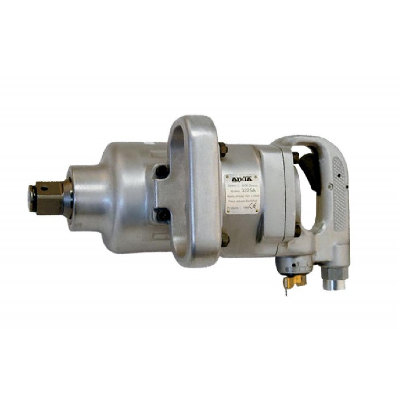 Llave de impacto neumática, uso en industria y talleres de vehículo industrial y garajes de neumáticos. Cuadradillo de 1". Uso continuo e intenso. Capacidad M-38, par de apriete 2.500Nm, velocidad 4.400rpm, longitud 350mm, peso 10,4kg., consumo 770 litros minuto, manguera Ø interior 13, rosca de entrada 3/8"