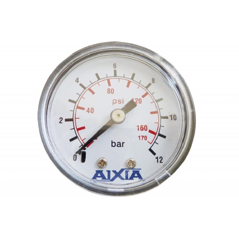 Manómetro de aire comprimido, rosca 1/8, rango de 12 bar, diámetro de esfera 53.