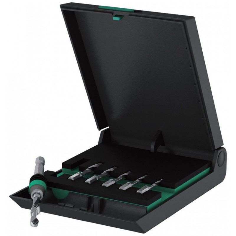 Juego de 7 piezas de putnas de macho de roscar combi de Wera, en una caja robusta de material plástico. Arrastre de 1/4", adecuado para porta-puntas con toma según la norma DIN ISO 1173-D 6,3. Con tecnología Rapidaptor de cambio rápido para la inserción en la máquina destornilladora o para conectar con el portabrocas del taladro electrónico. Una transmisión de la fuerza excelente gracias al vástago hexagonal. Elaboradas de acero de corte ultrarrápido (HSS). La elasticidad finamente compaginada proporciona una vida de servicio sumamente larga. Dispone de excelentes propiedades de centraje. Proporciona un trabajo de corte sin problema alguna. Una óptima evacuación de las virutas. Un riesgo tan sólo mínimo de un bloqueo por ladeo o inclinación. Un movimiento de inversión muy preciso.