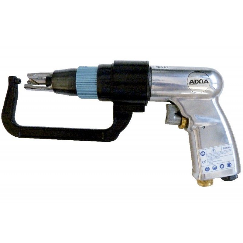 Quitapuntos de soldadura neumático presentado en estuche con brazo y 5 brocas, modelo 207, equipado con 2 brocas de Ø6,5mm y 3 brocas de Ø8mm, peso 1,2kg., velocidad 1.800R.P.M., consumo de aire 230 litros/minuto, Ø interior de manguera 8mm, rosca de entrada 1/4. Para uso continuo e intenso.