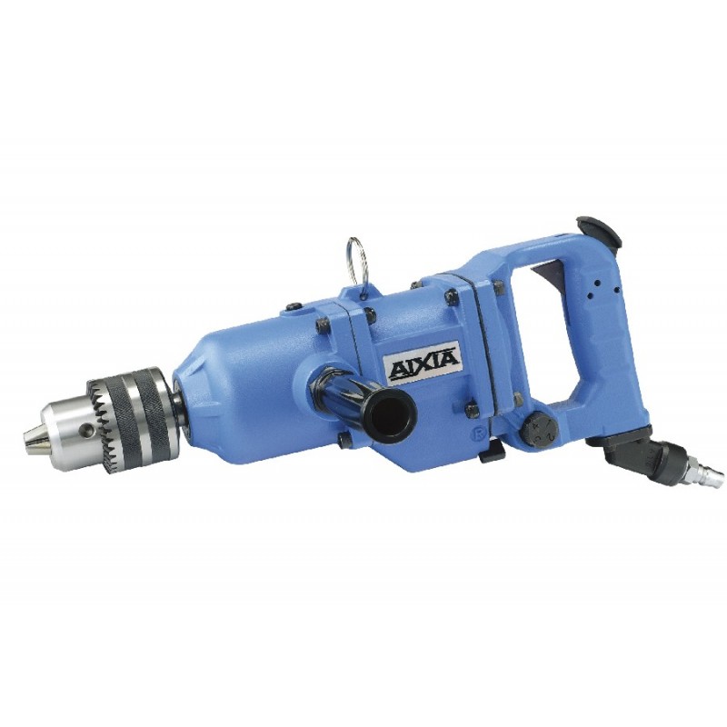 Taladro neumático recto, carcasa de aluminio, capacidad Ø16, portabrocas llave, potencia 700w, velocidad 1.000R.P.M, longitud 420mm, peso 6,3kg, consumo 1.000 litros/minuto, manguera Ø13, rosca 3/8. Uso continuo e intenso.