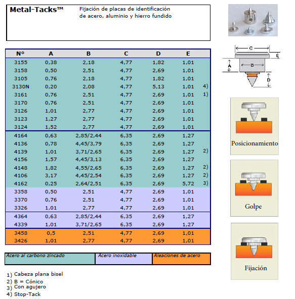 Sujección de placas de características en acero, acero inoxidable, aluminio y hierro fundido.