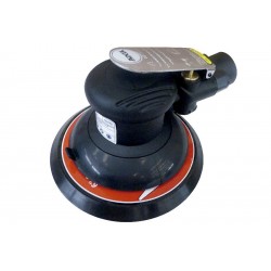 Lijadora rotorbital con aspiración de palma, Ø disco 150, rosca del eje 5/16, órbita 5, velocidad 11.000R.P.M., peso 0,8kg., consumo de aire 450 litros/minuto, manguera Ø interior 10, rosca de entrada 1/4. Para uso continuo e intenso