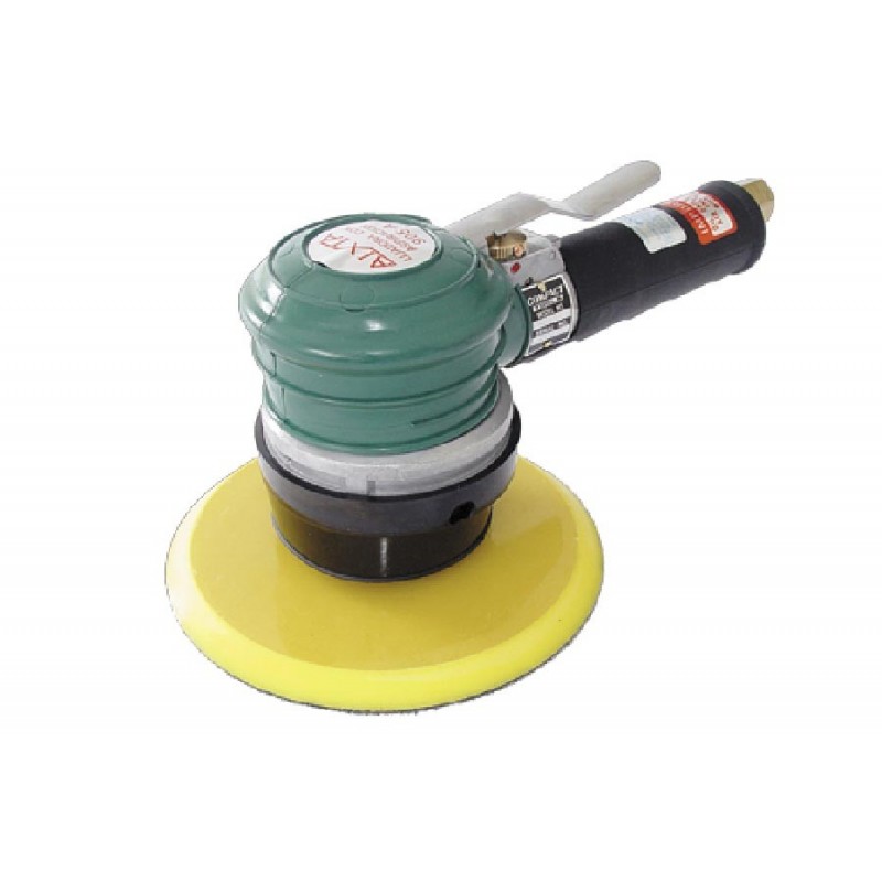 Lijadora rotorbital sin aspiración con mango, Ø disco 150, rosca del eje 5/16, órbita 10, velocidad 10.000R.P.M., peso 1,4kg., consumo de aire 400 litros/minuto, manguera Ø interior 10, rosca de entrada 1/4. Para uso continuo e intenso