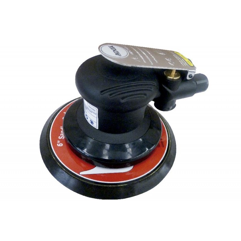 Lijadora rortorbital con aspiración con mango, Ø disco 150, rosca del eje 5/16, órbita 10, velocidad 11.000R.P.M., peso 0,8kg., consumo de aire 450 litros/minuto, manguera Ø interior 10, rosca de entrada 1/4. Para uso continuo e intenso