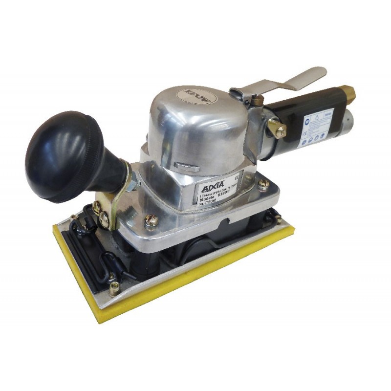 Lijadora orbital sin aspiración con base rectangular de 93x175 con velcro y pinzas, 8 orificios, órbita 5, velocidad 7.000R.P.M., peso 2,1kg., consumo de aire 400 litros/minuto, manguera Ø interior 10, rosca de entrada 1/4. Para uso continuo e intenso.